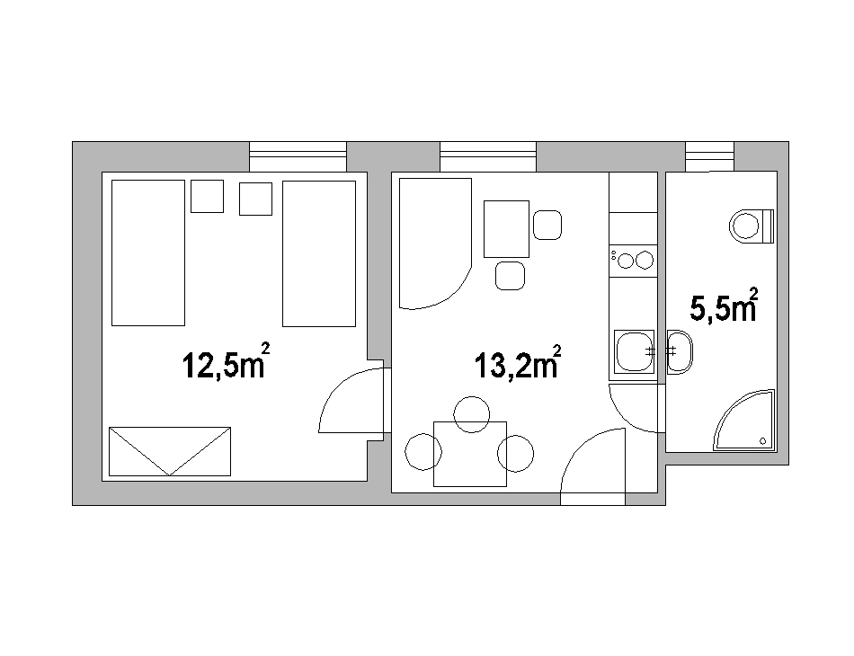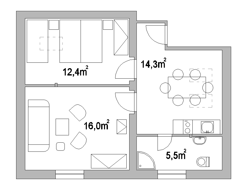 kout). Standardem každého apartmánu je podlahové vytápění, TV/SAT a
