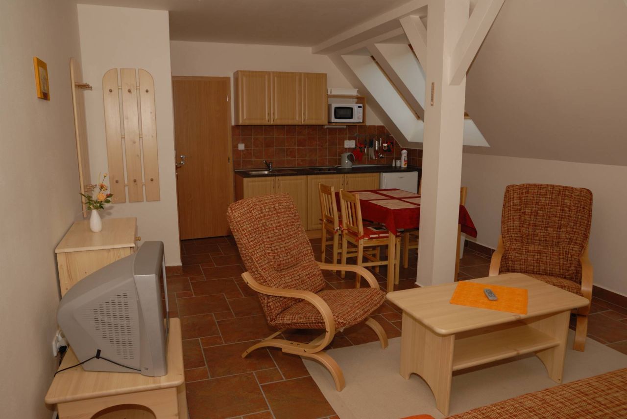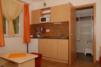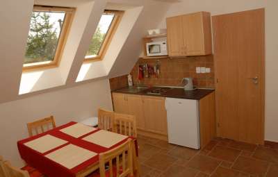 apartmány jsou vybaveny kuchyňskou linkou s nádobím, lednicí, rychlovarnou