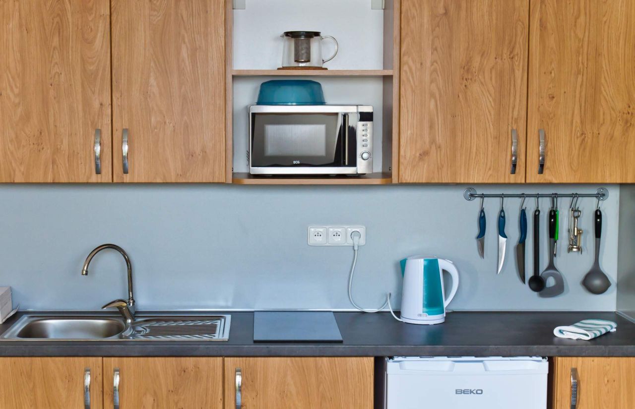 je vybavena kuchyňskou linkou, indukční čtyřplotýnkovou varnou deskou,
