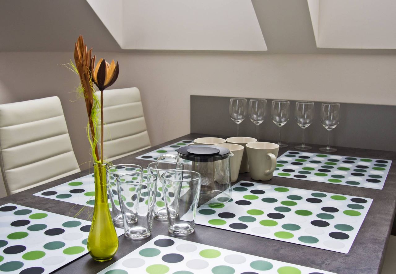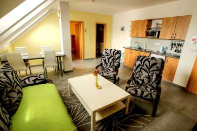 Ve dvoulůžkových apartmánech s možností až 2 přistýlek a třílůžkových apartmánech s možností až 2 přistýlek. Prostorné apartmány jsou vybaveny kuchyňskou linkou s nádobím, lednicí, rychlovarnou konvicí, elektrickou sklokeramickou dvouplotýnkou a mikrovlnou troubou. Samozřejmostí je vlastní sociální zařízení (WC, umyvadlo, sprchový kout). Standardem každého apartmánu je podlahové vytápění, TV a připojení k internetu přes Wi-Fi. Pohodlí ubytovaným hostům poskytnou sedací soupravy s křesly, umístěné ve všech apartmánech.